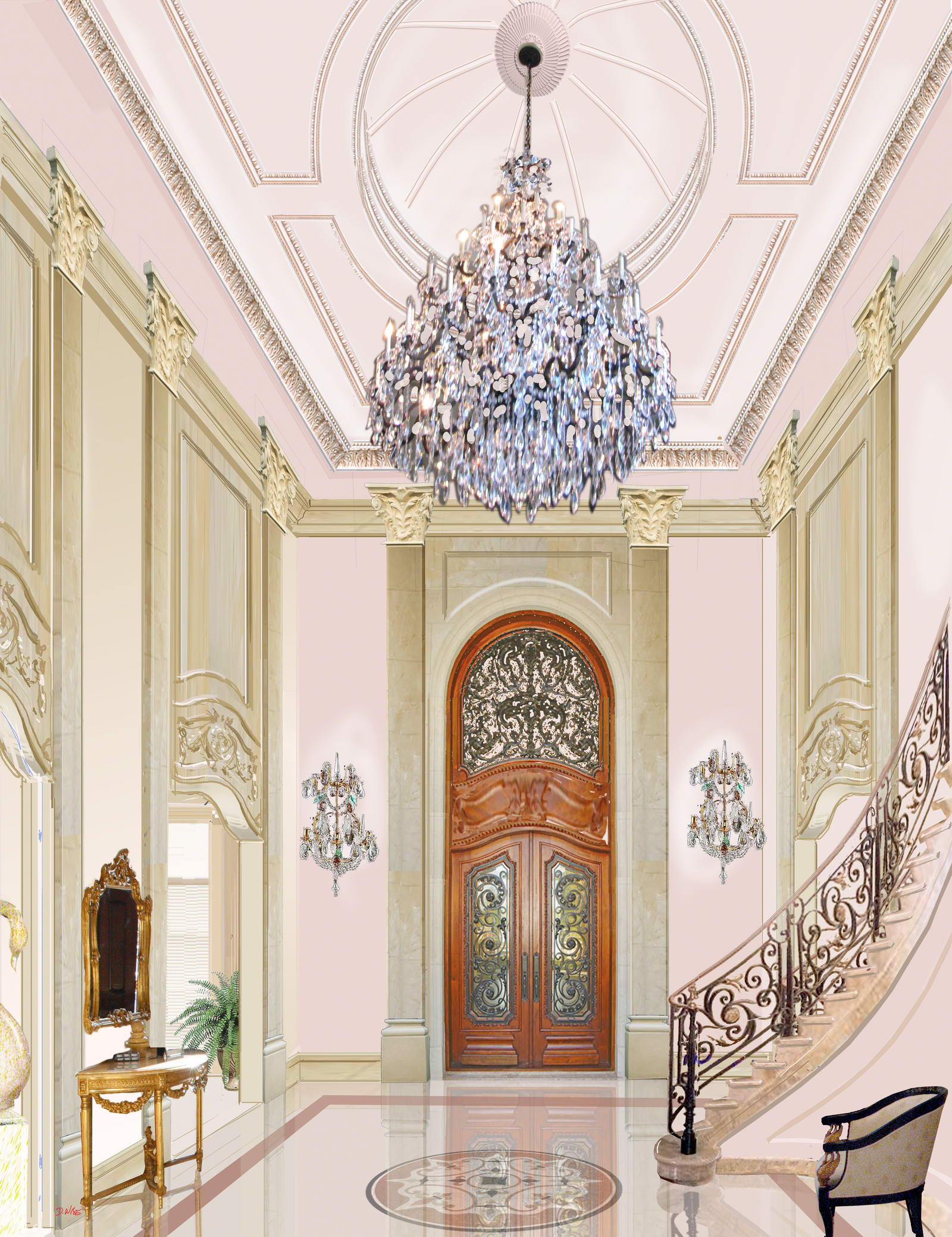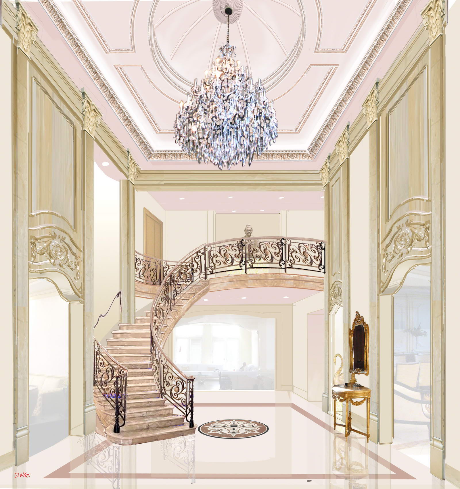 This well-appointed interior design for a two-and-half story foyer would embellish any Alpine, New Jersey mansion, accented with a swooping grand staircase of Italian marble steps-and-risers. The custom wrought-iron balustrade, brass rail and brass medallion insets gently lands on a high-polished Walker Zanger Italian white marble floor with medallion mosaic marble insert and pink marble border, has 12-inch base boards caped with two-inch moulding surrounds the room.