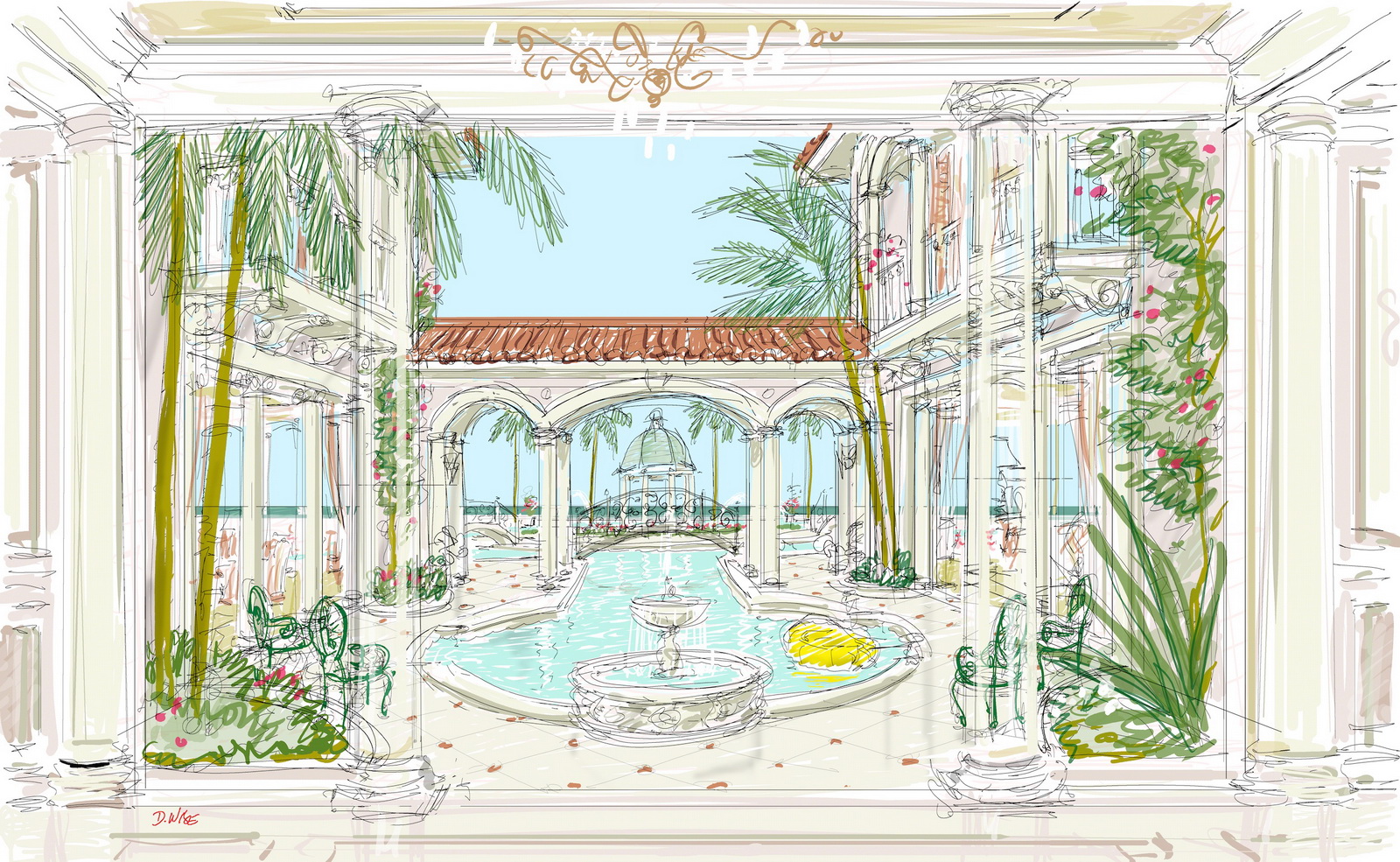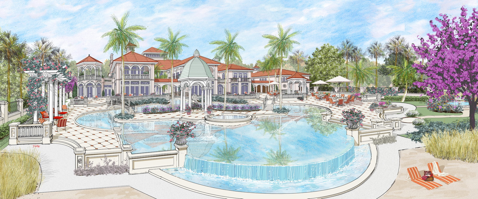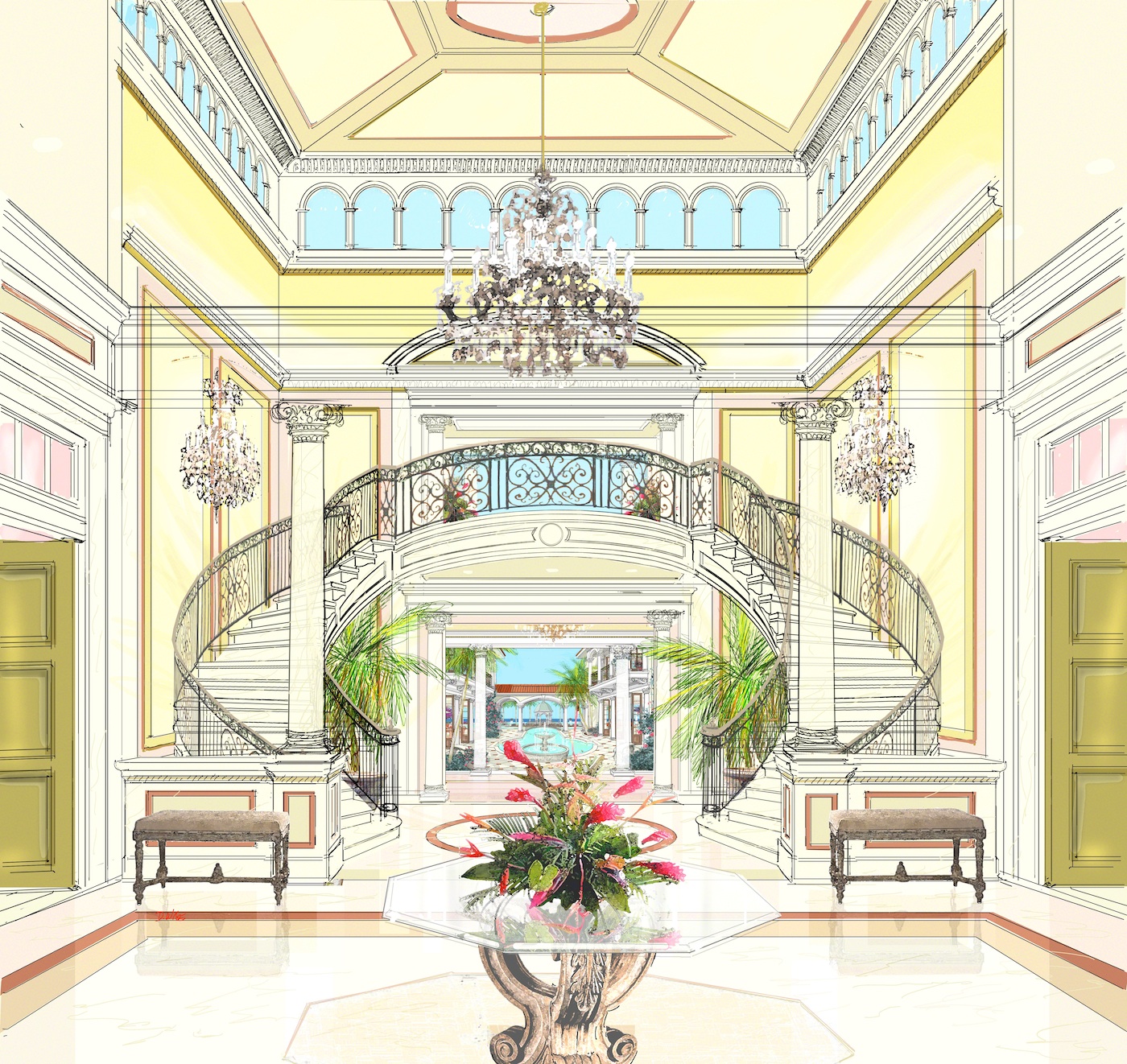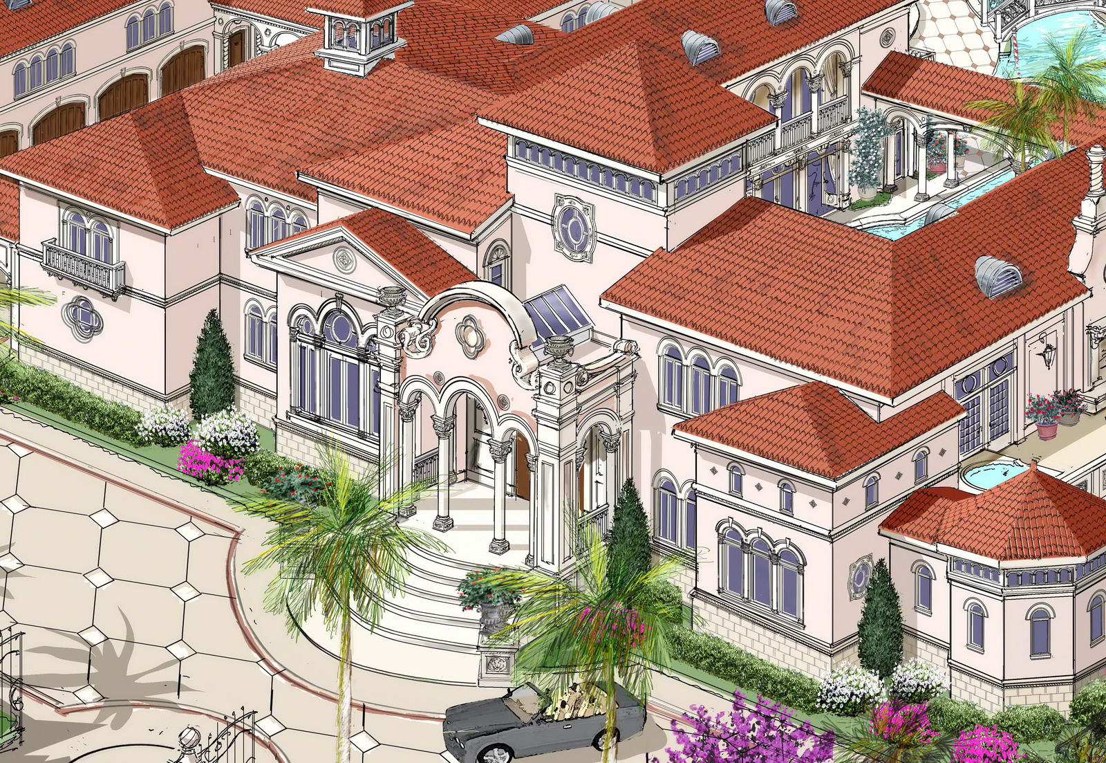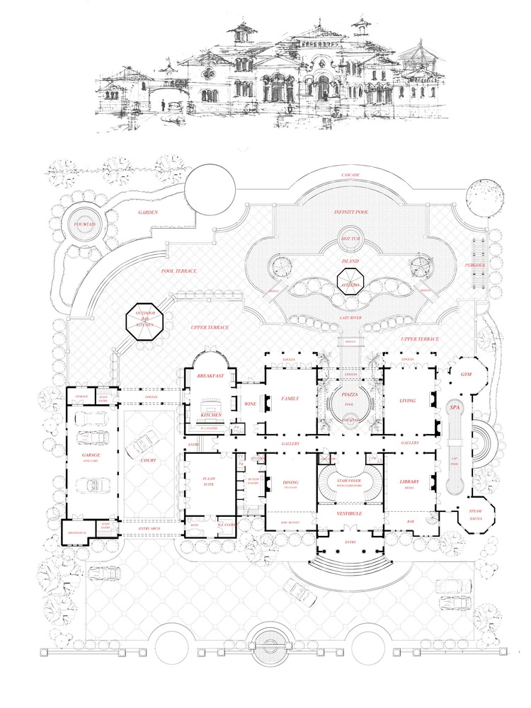Designed for a Mediterranean lifestyle, this award-winning design is a perfect build for warm climates like Jupiter Island, Florida or San Diego, California and enhances any waterscape. Enter though a gated street entrance to a magnificent 17,000 SF villa with a welcoming Venetian columned portico-a major theme of this design. A Venetian columned two-story Piazza-open-air courtyard off the entry foyer leads to 28,000-SF of customized outside living space-shown is a Venetian Grand Canal flowing through the Piazza to the infinity pool.