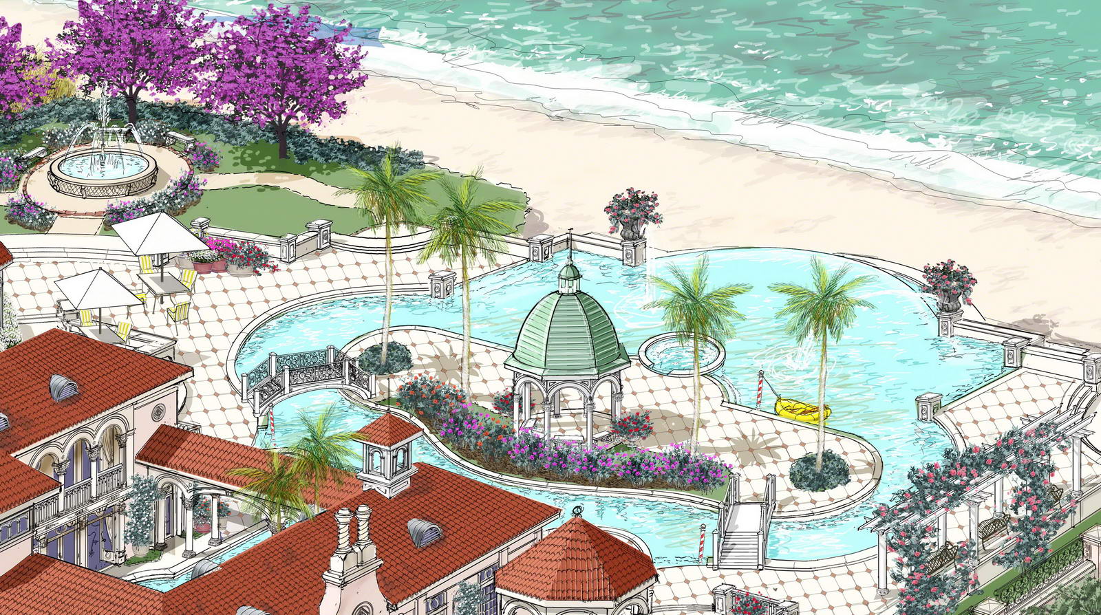 Outdoor living spaces include a 1,500-SF infinity pool, spa with custom Sun Precast fountains, a luxury Lynx outdoor kitchen supplied by appliance consultant Debbie Schaeffer, fireplace, cabana pavilion with full bath, steam shower, dressing rooms and storage. Bridges connect the dining pavilion and as well as the pool over the Grand Venetian Canal creating the most lavish resort-styled entertaining and family indoor/outdoor living space.