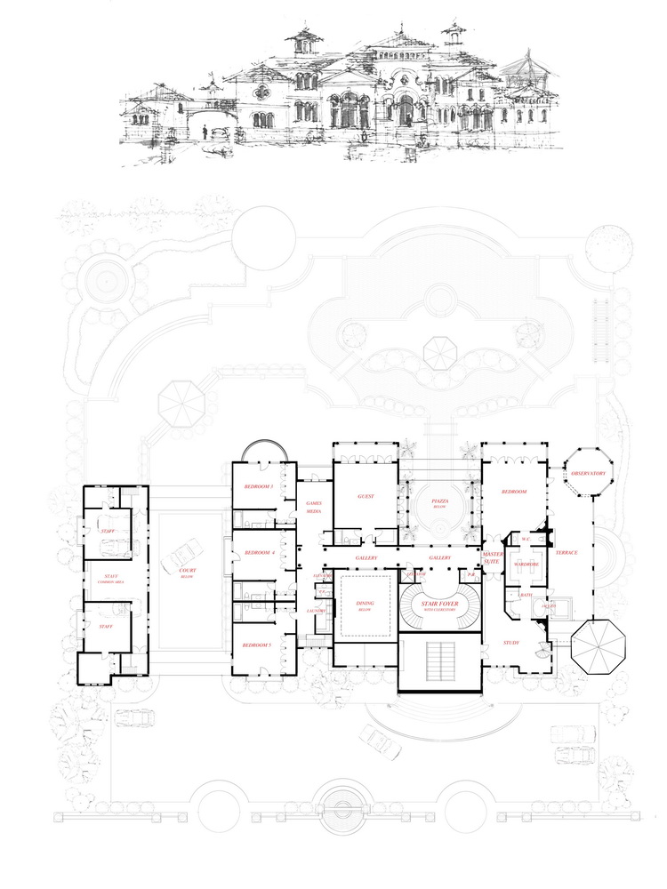 The estate can easily fit on an acre of land and is surrounded by a perimeter security wall. The design offers eight-bedroom suites, nine-full and three-partial baths including three-master 1,000-1,500-SF suites, formal two-story dining and living rooms, a White River Hardwoods paneled two-story library with decorative spiral stair, an expansive great room, chef's eat-in kitchen, butler pantry, breakfast solarium, theater/film and game rooms, wine cellar, elevator, in-door spa and lap-pool, eight-car garage with a Porte-Cochére auto court entrance to the main house. The wow factor comes the moment you enter the 1,200-SF foyer with 35-foot tray-ceiling, glass windowed surrounded turret and Walker Zanger Italian white marble double grand stairway and fountain. Ceiling heights range from a 12-foot minimum to 35-feet with large six-foot hallways throughout the home.