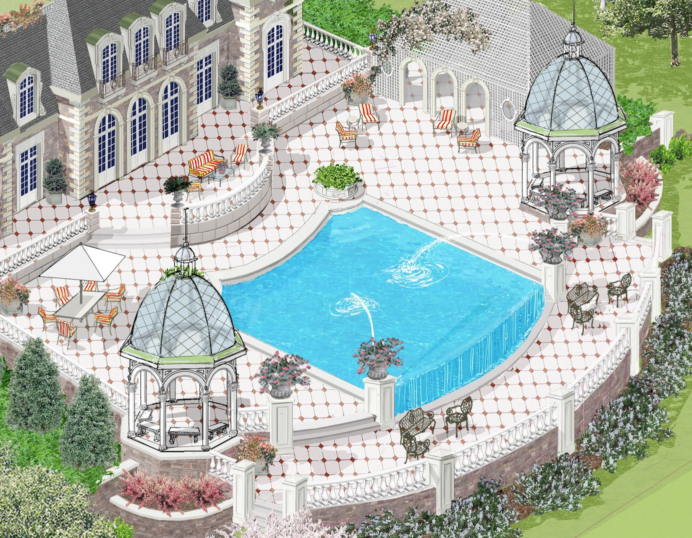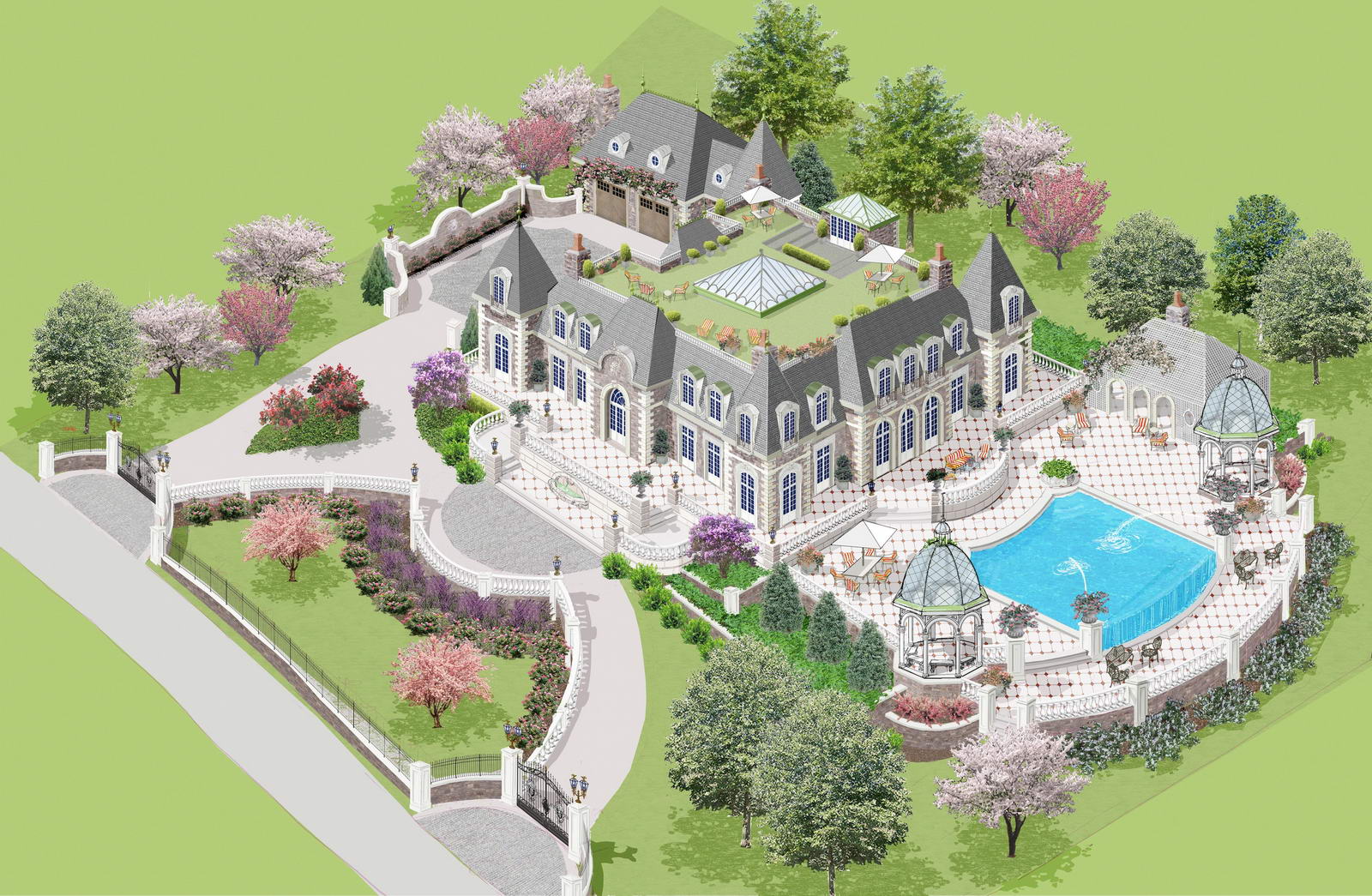 A 16-foot customized wrought-iron and glass front entry and glass roof ceiling effortlessly stream light through the two-story foyer creating an open well lit welcoming space. State-of-the-art chef's eat-in kitchen, butler pantry, wine cellar, great room, two-story formal parlor and dining rooms have a wall of French doors opening to terrace balconies overlooking a 1000-SF infinity pool and spa. Two-granite and limestone year-round gazebos with iron and steel-glass doomed roofs anchor balcony backyard terraces as well as a cedar-lattice enclosed outdoor kitchen and lounging areas. The first floor also includes: master ensuite bedroom, solarium and optional White River Hardwoods mouldings and hand carved architectural wood-paneled two-story library with decorative spiral stair. Other custom design features include home theater/film, game rooms, elevator, in-door spa, gym and massage rooms. A four-car garage with a Porte-Cochére auto court has an entrance to the main house-ceiling heights range from 12-foot minimum.