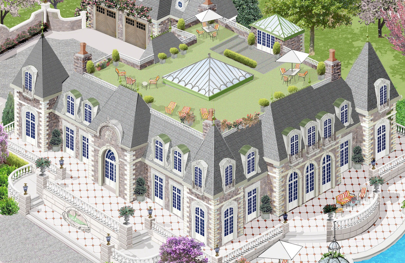This European styled 9,000-SF three-story design emphasizes a two-story foyer leading into a three-story central hall with glass roof and ballroom. The five-ensuite bedroom design has six-full and three-partial baths. The gated street entry with curved limestone 300-foot balustrade wall delivers you to a cobble stone entrance motor court. Guests are greeted with multi-level radius terraces of Walker Zanger travertine and granite with French doors surrounding the ground floor-extending outside living to the interior rooms. Granite hand-forged stone with limestone facade accents and trim have quoined-corners with decorative custom Sun Precast architectural cast-limestone surrounds for facade windows and doors. The unique feature of this design is an all-green 3,000-SF environmental friendly outdoor living-roof, giving views to Los Altos Hills California valley and beyond to the bay.