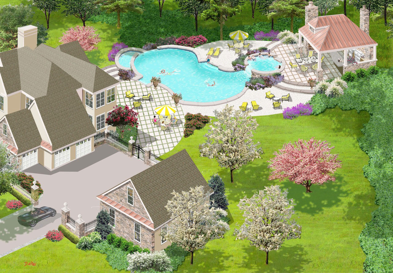 - A 20,000SF landscaped luxury out-door living remodel receives infinity pool, cabana, outdoor kitchen, travertine entertainment–lounging terraces, and new garages